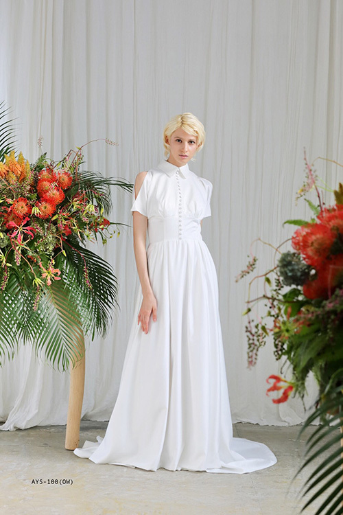 シルエットも素材感も全てがシンプル。シンプルさの中にも存在感があり素朴さが人気のウエディングドレス。コーディネート次第で表情の変化が楽しめるドレスです。